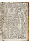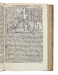 Le titre du premier volume, en rouge et noir, est orné d’un encadrement gravé formé de colonnes torsadées et porte la marque du libraire- imprimeur Jacques Mareschal, successeur de l’imprimeur lyonnais Michel Topié, qui en avait donné une édition en 1490. Les deuxième et troisième parties n’ont pas de titre spécifique, mais un premier feuillet introductif orné d’un bel encadrement (différent pour chacune) composé de motifs foliacés ou historiés. Le colophon à la fin de la troisième partie mentionne l’éditeur Antoine Du Ry et la date de 1529.