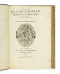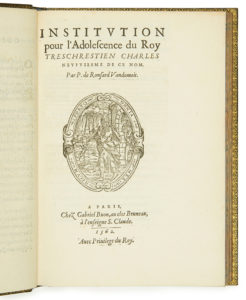 - Pierre de RONSARD. Institution pour l’Adolescence du Roy treschrestien Charles neufviesme de ce nom. Paris, Gabriel Buon, 1562. (6f.) / A4, B2. Barbier, Discours, 12 // Tchemerzine-Scheler, V-436-b // USTC, 14906. L’une des trois éditions princeps qui se distinguent par de légères variantes de composition, sans qu’on puisse donner la priorité à l’une d’entre elles.