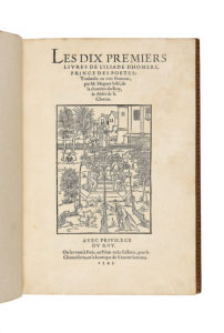 [ SALEL ]. HOMÈRE. — Les Dix premiers livres de l’Iliade d’Homere, prince des poetes : Traduictz en vers Francois par M. Hugues Salel, de la chambre du Roy, & Abbé de S. Cheron. — Paris, au palais en la Gallerie, pres la Chancellerie, en la...