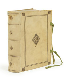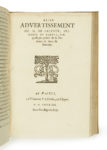 monde. Reveue & corrigée par l’Auteur… — Paris, L’Huyllier, 1584. Brief advertissement… sur quelques points de sa Premiere & Seconde Semaine. — Paris, L’Huillier, 1584. — Hubert GOLTZIUS. Thesaurus rei antiquariae huberrimus… — Anvers, Plantin, 1579 — 5 ouvrages en un volume in-4, vélin crème, double filet noir sur les plats avec fleuron central et dans les angles, dos lisse orné de même, rubans ( Reliure de l’époque avec décor moderne et rubans renouvelés ).