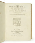 Intéressante réunion des œuvres majeures de Du Bartas, reliées en un volume à l’époque. Elle se complète d’un ouvrage de Hubert Goltzius (1526-1583), peintre et historiographe de la maison d’Espagne, qui fut l’un des premiers numismates de son temps. Son Thesaurus rei antiquariae est son ouvrage le plus important.