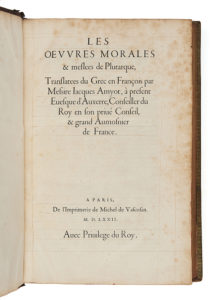 C’est grâce à Jacques Amyot (1513-1593), évêque d’Auxerre qui traduisit plusieurs auteurs antiques, que l’œuvre de Plutarque fut largement diffusée en Europe au XVIe siècle. Outre les Œuvres morales , qui parurent pour la première fois chez Michel de Vascosan en 1572, il avait également traduit les Vies des hommes illustres , parues chez le même éditeur en 1559 (cf. le n° 299 du présent catalogue).
