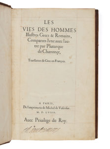 [ AMYOT]. PLUTARQUE. — Les Vies des Hommes Illustres Grecs & Romains, Comparees l’une avec l’autre par Plutarque de Chæronee, Translatees de Grec en François. — Paris, Michel de Vascosan, 1559. — 2 volumes in-folio, veau Lavallière, dos...