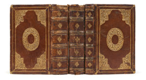 d’Aoust 1570. iusques au regne de Henry troisiesme. — Meidelbourg, Henrich VVolf, 1577 (Genève, Jérôme Commelin et Pierre de Saint-André ?, 1576). — 3 volumes in-8, veau marron, décor doré sur les plats avec encadrement de deux filets dorés, larges écoinçons et médaillon central doré à fond azuré, dos à 4 nerfs, tranches dorées (