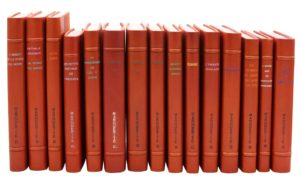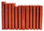 Ensemble 12 vol. in-8 et in-12, demi-chagrin fauve à bandes, dos lisse à deux faux-nerfs titré à l’œser de couleur, couverture et dos (Abbaye de Maumont).L’Empire français. 1940. Édition originale du premier livre de Marguerite Donnadieu, avant qu'elle ne prenne le pseudonyme de Marguerite Duras, co-écrit avec Philippe Roques. Inscription sur le faux-titre, 4e de couverture tachée.
