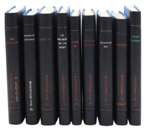 in-12, demi-chagrin noir à bandes, dos lisse à deux faux-nerfs titré à l’œser de couleur, couverture et dos (Abbaye de Maumont).Moderato cantabile. Paris, Minuit, 1958. Édition originale. Envoi autographe signé à Pierre Descargues.