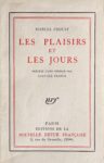 On joint, du même : Les Plaisirs et les Jours. Paris, Gallimard, 1924. In-12, broché, chemise et étui (Boichot). Réimpression préparée du vivant de l'auteur de l'édition originale de 1896, avec la même préface d'Anatole France. Un des 392 exemplaires sur vélin pur fil. On a fixé au faux-titre une carte imprimée : De la part du Dr Robert Proust en souvenir de son frère Marcel.