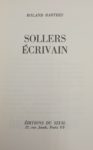 Sollers écrivain. Paris, Le Seuil, 1979. In-8, broché. Édition originale, sans tirage en grand papier. Envoi autographe paraphé : « à Bernard Henry, entre amis... RB ». Il s'agit probablement de Bernard-Henri Lévy.