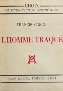 CARCO (Francis). L’Homme traqué. Paris, Albin Michel, 1929. In-8, reliure industrielle en bakélite olive, plats biseautés à charnières articulées, bandeau en fer moulé et pièces de titre métalliques incrustés dans le premier plat et le dos, doublure et gardes en papier peint au pochoir, tête dorée, premier plat de couverture (Reliure Jotau). Très belle reliure Jotau, procédé de reliure industrielle breveté par Joseph Taupin qui connut un vif succès durant la période Art Déco. Premier plat et dos uniformément assombris.