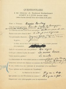 Réponses autographes à un questionnaire imprimé pour une enquête de Charles Quinel sur les chansonniers ; il a signé en tête « Maurice Boukay », est originaire de « Franche-Comté de Bourgogne », est également vigneron ; son musicien préféré est « le merle » ; ses chansonniers préférés : « Thibaut de Champagne, Piron de Bourgogne, Pierre Dupont »…