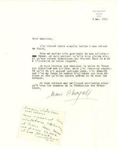 1 page in-4 à son adresse Les Collines, Vence, enveloppe. Au sujet de son « affiche-Vence. Je suis content qu’elle vous plaise ainsi qu’aux autres rédacteurs qui étaient dans le midi à l’occasion de votre Congrès ». Il a demandé qu’on en retire…
