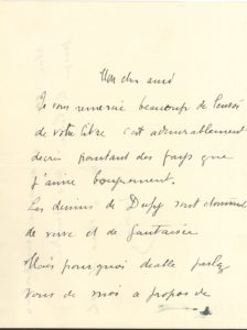 3 pages in-8, enveloppe. Il remercie de l’envoi du livre [La Terre frottée d’ail] : « C’est admirablement décris pourtant des pays que j’aime bougrement. Les dessins de Dufy sont étonnants de verve et de fantaisie. Mais pourquoi diable parlez-vous de moi à propos de St Tropez où je n’ai jamais été ainsi que le Père Renoir d’ailleurs je suis si peu peintre (dans mes mœurs) que je ne comprends pas ces erreurs de votre part. Pour ce qui est des droits de reproduction ce n’est pas vous qui les paierez mais votre éditeur. Alors ça n’a aucune importance puisque le livre sera vendu »…