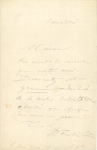 1 page in-8. On vient de le prévenir « que notre ami Duranty est gravement malade à la Maison Dubois (Fb St Denis) ». Il donne son adresse « 8 rue des Beaux-Arts ».