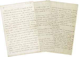 42 pages in-8, 2 adresses « à Madame Junot ». Belle correspondance amoureuse. Gavarni fut introduit dans le salon de la duchesse d’Abrantès vers 1830 par son ami Honoré de Balzac. Il devint rapidement un familier de la famille, et lorsque Joséphine Junot, fille aînée de la duchesse, revint à Paris, après quelques années dans un couvent, pour recevoir les insignes de chanoinesse (ce qui la faisait appeler « Madame Junot »), Gavarni succomba à son charme. Entre eux naquirent bientôt les sentiments les plus vifs dont les lettres que nous avons sous les yeux révèlent les progrès et les entraves. Afin de justifier à leurs propres yeux leur intimité croissante, tous deux décidèrent de se considérer comme frère et sœur… Nous ne pouvons en citer ici que de brefs extraits.