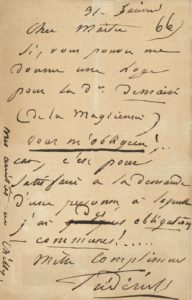 1 page in-12 avec adresse et 1 page in-8 ; et 2 pages in-8. Billet au directeur de théâtre Anténor Joly : il viendra au théâtre « pour vous satisfaire sur tout ce que vous désirez ». – 31 janvier 1866, demande de loge pour la Magicienne.