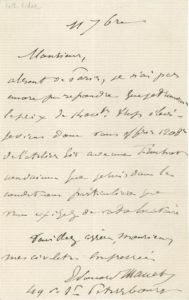 1 page in-8. Absent de Paris, il trouve le prix de 1400 F « trop élevé. Je viens donc vous offrir 1200 F de l’atelier sis avenue Frochot convaincu que je suis dans les conditions particulières que vous exigez de votre locataire »…