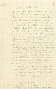 « Mon cher ami, Je ne suis pas mort et je pense toujours à vous. J’ai travaillé à deux décorations que je vous destine. Mais j’ai voulu m’absenter, fatigué du poêle d’atelier ». Il se remettra au travail dès son retour, et « tâcherai de vous donner des Jean Goujon épatants. Excusez mon long silence, mais je deviens de plus en plus inquiet, nerveux ; si je n’avais pas cette toquade imbécile de mettre des couleurs sur des toiles je serais bien malade. J’ai travaillé des mois à des études fort peu intéressantes. J’attends avec impatience mon retour pour en voir le résultat ». Il ajoute qu’il déménage encore en juillet « pour aller rue Tourlaque 7, même atelier moins cher ».