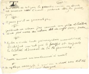 1 page petit in-4 (petite déchirure au bas touchant deux mots). Poème publié par Apollinaire avec six autres sous le titre de Banalités dans Lacerba (15 avril 1914), et recueilli dans Poèmes retrouvés (Pléiade, p. 659) ; citons le commentaire de MM. Adéma et Décaudin : « Il s’agit de fonds de tiroir qu’Apollinaire s’est manifestement amusé à rassembler [...] Té est une juxtaposition de morceaux disparates. L’esthétique de la surprise chère à l’auteur s’épanouit ici dans le rire ».