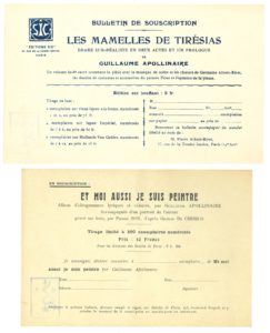 Et moi aussi je suis peintre (1914, non paru). Les Mamelles de Tirésias (Sic, 1917). Calligrammes (Mercure de France, 1918).