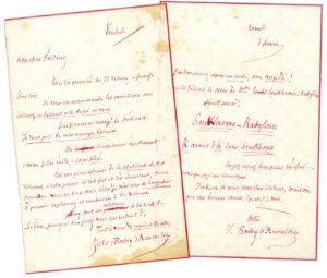 « Merci de vos corrections, & continuez les ! [...] Penser que vous surveillez les bévues me rafraîchit le sang, – et me calme. J’avais besoin d’être rafraichi »... – [Jeudi]. Il envoie la dédicace et « l’épreuve de la fin du 1er volume [...] Vous aurez l’autre demain à votre lever. [...] Je trouve aussi le volume court & je n’ai rien pour le rembourrer »... Il dresse la liste des « Ouvrages du même auteur » à l’encre rouge soulignée d’encre verte. – Vendredi. Il envoie les épreuves du 2e volume : « Je vous en recommande les corrections avec instance en faisant acte de foi en vous. [...] J’ai une peur affreuse de la platitude de nos volumes. Si votre papier est très fort et très consistant, nous pourrons nous en tirer. Mais, hélas ! je n’ai rien de longueur à pouvoir capitonner et rembourrer le 2e volume. Lévy met son catalogue à la suite de ses livres. Pourquoi n’en feriez vous pas autant ? »... – Samedi. Une « anxiété » lui fait préciser l’orthographe du nom de Mme Soukhowo-Kabylinn.