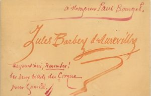 Billet sur carte avec sa signature gravée, à l’encre rouge : « à Monsieur Paul Bourget. Aujourd’hui, remember ! Les deux billets du Cirque pour Samedi ».