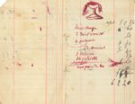 3 feuillets extraits d’un carnet, avec listes à l’encre rouge de dépôts pour blanchissage, et 2 petits dessins à l’encre rouge : flèches croisées, calice.