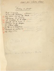 Ces poèmes ont pour titres : Perte d’auréole, Mademoiselle Bistouri, Any where out of the World, Assommons les pauvres, Les bienfaits de la Lune, Laquelle est la vraie ?, La soupe et les nuages, Le galant tireur, Le tir et le cimetière, Portraits de maîtresses, Les bons chiens, tous faisant partie du Spleen de Paris (1869). Six sont précédés sur ce manuscrit d’une croix, tracée au crayon rouge ; avec la mention : publié (au crayon de la main de Charpentier). Ce sont ceux qu’il a retenus et publiés dans la Revue nationale et étrangère du 31 août au 11 octobre 1867. Mademoiselle Bistouri porte au contraire la mention non publiable ; et quatre : Perte d’auréole, Assommons les pauvres, La Soupe et les nuages, Le galant tireur sont sans indication. Au bas de la page, Charpentier a aussi noté l’adresse : Baudelaire 28 rue de la Montagne à Bruxelles.