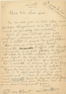 Léon BLOY — L.A.S., Lundi [1887], à « Mon très cher ami » [Jules Destrée ?]