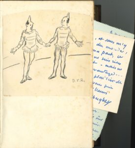 La Seine (L. Vanier, 1894) débroché (couv. déchirée). Le Chariot errant (Éd. du Monde illustré, 1910, cart.), avec le dessin original de J.F. RAFFAËLLI ayant servi pour la couverture, plus2 L.A.S. de THEO VAN RYSSELBERGHE (1911). Vagabondages à travers la peinture et les paysages, les bêtes et les hommes, ill. par H. Epstein (Ollendorff, 1921), un des 300 ex. sur vélin pur fil in-4° couronne avec croquis marginaux. Avec la liste du service de presse par Coquiot ; 13 L.A.S. à lui adr. par Ad. Aderer, H. Austruy, Eug. Blot, A. Chollier (3), Max. Dethomas, Suz. Després, M. de Fleury, L. Frapié, U. Gohier… ; dossier de presse.Bonnard (Bernheim-Jeune, 1922), un des 25 ex. de tête sur Japon, avec L.A.S. de Félix FENEON (1912), une L.S. du libraire H. Floury (1913), 3 petits catalogues d’exposition (1919-1913), et une épreuve lithogr. Degas (Ollendorff, 1924), un des 20 ex. de tête sur Hollande, broché, non rogné. Suite provinciale avec 92 dessins inédits de Marc CHAGALL (A. Delpeuch, 1927), n° I des 25 ex. hors commerce, broché. Avec 3 L.A.S. de l’éditeur André DELPEUCH à Mauricia Coquiot (avec liste des souscripteurs et comptes, 1927) ; 4 L.A.S à elle adr. au sujet du livre par Jacques DARNETAL (2), Octave GUILLONNET et Pierre Neuzillet, et une l.s. d’Henry Lapauze ; le bulletin de souscription (et celui de Ma Vie) ; 4 petits catalogues d’exposition de Chagall (1924-1926) et coupures de presse.