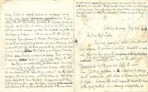 4 pages in-12 remplies d’une petite écriture (papier froissé) ; en anglais. Rare lettre à la fille de son ami le Major Miller, décédé. [Après sa mort, ses filles avaient quitté Holyrood, où De Quincey aimait retrouver ses amis] Après quelques lignes d’introduction sentimentale, et se disant malade d’écrire sans cesse, il dit repenser continuellement avec des souvenirs douloureux aux heureux moments passés sous le toit de sa chère Miss Jessie ; et il regrette ces soirées trop rares, depuis qu’il a été obligé de quitter le havre tranquille de la maison Miller Ces tristes souvenirs contrastent avec sa sombre solitude actuelle ; et l’espoir de passer une nouvelle soirée sous ces mêmes lampes est comme l’habit vernal d’un bonheur à venir, au lieu du triste habit automnal d’un bonheur disparu. Cela peut paraître sentimental, mais est profondément vrai. Mais il craint que le dimanche soir Jessie soit prise par ses observances religieuses, une conférence, un sermon de charité ou une réunion missionnaire, au lieu de passer la soirée à Duncan Street, de façon plus profitable. Car à la réunion missionnaire, elle ne contribuera guère qu’à la 7e, voire la 70e part, de la conversion d’un Néo-Zélandais ou d’un prince emplumé d’Owhyee. Tandis qu’en accordant sa présence à Duncan Street, elle donnerait à un fils de la Croix un immense bonheur. Il a été bien occupé à écrire quelques lignes commémoratives pour le cénotaphe au Major Miller, de la Horse Guards Blue, pour lesquelles il aurait besoin de renseignements. Ces lignes sont au nombre d’environ 36 ; trop certes pour une épitaphe, destinée au lieu réel de sépulture ; mais il s’agit d’un cénotaphe, auquel est généralement accordé un privilège plus étendu... « […] The moral, my dear Miss Jessie, is this – that I, soul-sick of endless writing, look back continually with sorrowful remembrances to the happy interval which I spent under your roof; and next after that, I regret those insulated evenings (scattered here and there) which, with a troubled pleasure – pleasure anxious and boding – I have passed beneath the soft splendours of your lamps since I was obliged to quit the quiet haven of your house. Sorrowful, I say, these remembrances are, and must be by contrast with my present gloomy solitude; and if they ever cease to be sorrowful, it is when some new evening to be spent underneath the same lamps comes within view. That which is remembered only suddenly puts on the blossoming of hope, and wears the vernal dress of a happiness to come, instead of the sad autumnal dress of happiness that has vanished. […] And what I fear is — that you, so strict in your religious observances, will be dedicating to some evening lecture, or charity sermon, or missionary meeting, that time which might be spent in Duncan Street, and perhaps — pardon me for saying so — more profitably. ‘How so?’ Why, because, by attending the missionary meeting, for example, you will, after all, scarcely contribute the 7th, or even the 70th, share to the conversion of some New Zealander or feather-cinctured prince of Owhyee. Whereas now, on the other hand, by vouchsafing your presence to Duncan Street, you will give — and not to an unbaptized infidel, who can never thank you, but to a son of the Cross, who will thank you from the very centre of his heart — a happiness like that I spoke of as belonging to recurring festivals, furnishing a subject for memory through one half of the succeeding interval, and for hope through the other. […] I have been for some time occupied at intervals in writing some memorial ‘Lines for a Cenotaph to Major Miller, of the Horse Guards Blue,’ and towards which I want some information from you. The lines are about thirty-six in number; too many, you will say, for an epitaph. Yes, if they were meant for the real place of burial; but these, for the very purpose of evading that restriction, are designed for a cenotaph, to which situation a more unlimited privilege in that respect is usually conceded. » Alexander H. Japp, Thomas De Quincey His Life and Writings (1890), p. 227-229.