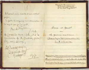 87 pages d’un carnet in-12, relié demi-cuir de Roussie rouge à coins, étiquettes de titre sur le plat sup. et le dos. Pièce de théâtre écrite par le fils de Georges Feydeau, à l’âge de 17 ans. Cette œuvre de jeunesse du futur journaliste est désignée comme un « Drame tragico-héroïco-comico-sentimental en 6 actes en vers » et signée « Alexandre Dumas cousin (à la mode de Bretagne) & Michel Feydeau », avec dédicaces des deux (qui n’en font qu’un) « à Rostand, mon maître », « A Corneille, mon idole, et à la mémoire de A. Dumas père & fils, mes aïeux », et aux protagonistes de la pièce qui met en scène Michel Feydeau lui-même, ainsi que son cousin Jean Hellmann (futur directeur du Grand Rex) et son ami Robert Calmann-Lévy (futur éditeur) et l’ex-amante d’Hellmann, Dora Mathi (alias Dora Misrahi ou Dora Klotz), ainsi que d’autres comparses. La pièce est restée inachevée et s’interrompt à la scène 2 de l’acte V.