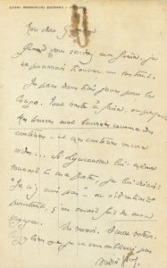 1 page in-12 au dos d’une carte postale illustrée (peinture de B. Gozzoli ; petite trace de rouille). Avant le voyage au Congo. Il part dans trois jours pour le Congo et n’a pas de temps : « Quand vous seriez mon frère, je ne pourrais trouver un instant. […] Tout reste à faire, ou presque. Mes heures sont bourrées comme des cantines – et mes cantines encore vides… Si Lynconion lui-même sonnait à ma porte, je lui dirais : “Je n’y suis pas” – ou s’il entrait pourtant, c’en serait fini de mon voyage »…