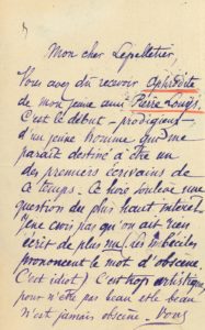 Lepelletier a dû recevoir Aphrodite « de mon jeune ami Pierre Louÿs. C’est le début – prodigieux – d’un jeune homme qui me paraît destiné à être un des premiers écrivains de ce temps […] Je ne crois pas qu’on ait rien écrit de plus nu. (Les imbéciles prononcent le mot d’obscène. C’est idiot). C’est trop artistique, pour n’être pas beau et le beau n’est jamais obscène. Vous auriez un brave et bel article à faire à ce sujet, lisez cet admirable conte milésien, vous ne regretterez pas les deux heures que vous y emploierez »…
