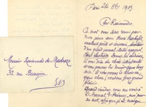 2 pages in-8, enveloppe. Recommandation de « mon jeune ami Henri BARBUSSE, excellent poète et écrivain, directeur d’un grand journal illustré espagnol Paris ilustrado. Donnez-lui audience », il lui fera un grand plaisir. Il attend sa visite à l’Arsenal…
