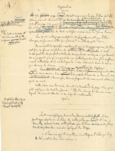 Ce brouillon est abondamment raturé (en partie au crayon bleu) et corrigé.