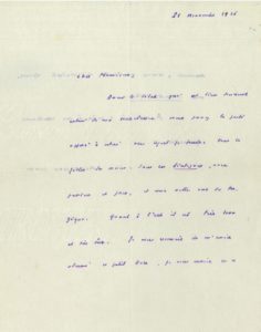 1 page et demie in-4, enveloppe. Compliments et remerciements pour ses Dialogues avec le corps endormi (Les Amis d’Édouard, Paris 1925) : « vous prenez le parti opposé à celui vers lequel je tends, vous les poètes du moins, dans ces Dialogues, avec passion et force, et avec cette vue du tragique. Quant à l’art il est très beau et très sûr. Je vous remercie de m’avoir envoyé ce petit livre ». Il lui envoie quant à lui « comme une sorte de modeste réponse, mes Nouvelles Noces »…