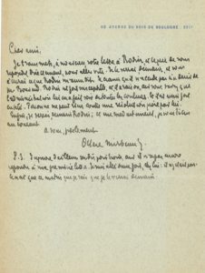 ¾ page in-8 à son adresse 68 Avenue du Bois de Boulogne XVIe. Au sujet de Rodin. Il transmet sa lettre à Rodin, qu’il verra le lendemain : « Je crains qu’il n’accède pas au désir de M. Bouvard. Rodin est fort susceptible, et il a raison, car vous savez que l’administration lui en fait voir de toutes les couleurs. Et il est aussi fort entêté. Personne ne peut rien contre une résolution prise par lui »…