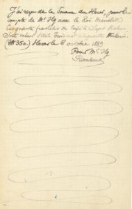 « J’ai reçu de la douane du Harar, pour le compte de Mr Ilg avec le Roi Ménélik cinquante fraslehs de café à sept thalers, soit valeur totale trois cent cinquante thalaris. (Th 350) »… Il signe « Pour Mr Ilg Rimbaud ». Le bas de la page est barré d’une ligne en zigzag.