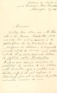 1 page et quart in-8. Il charge son correspondant d’aller chez Hachette demander à Fourret « s’il a renoncé à la publication de la traduction de Madame de Soldan à laquelle j’avais refusé de donner mon autorisation, et si nous sommes libres de publier notre traduction. En cas que oui, je vous prie de présenter le roman à un éditeur, soit Quantin (qui a publié mes Contes juifs), et s’il refuse, à Ollendorf, qui est en train de publier un autre roman de moi »…