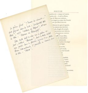 demi-page in-8 et 2 p. in-8 imprimées. Notice pour le poème Berceuse, avant sa publication dans la revue américaine Mesa à l’automne 1945, et qui prendra place dans la 3e édition d’Éloges (Gallimard, 1948).