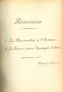 56 pages grand in-8, reliure demi-maroquin vert sombre à coins. Copie soignée sur papier vélin de deux textes : Les Marionnettes de l’Amour et La Femme comme Parangon d’Art, publiés dans le recueil collectif Féminies, « huit chapitres inédits dévoués à la Femme, à l’Amour, à la Beauté » par Schwob, Gyp, Abel Hermant, Henri Lavedan et Octave Uzanne (Paris, imprimé pour le Bibliophiles contemporains, Académie des Beaux Livres, 1896), frontispices d’après Rops, couverture par G. de Feure.