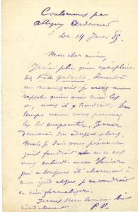 1 page in-8. « Je n’ai plus qu’un exemplaire des Fêtes Galantes. Quant à un manuscrit je crois me rappeler qu’un ami mien les a, mais il y tiendrait. » Il pourrait les lui emprunter « mais je dois vous prévenir qu’il faudrait en ce cas vous entendre avec Vanier qui a toujours été charmant à mon égard et que je ne voudrais en rien formaliser »…