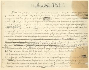 Le manuscrit, à l’encre noire, est abondamment raturé et corrigé. Il présente deux versions du passage où Pied prédit l’avenir du narrateur, ainsi que quelques variantes avec le texte imprimé. Le titre Maître Pied est calligraphié sur un titre primitif gratté : Un individu modèle.