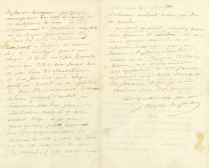 4 pages in-8. Quatre mois avant sa mort. Âgé de 81 ans, et très affaibli, son état est le même : « je ne puis ni manger, ni dormir, et réduit à l’état de squelette, j’ai peine à me tenir sur mes jambes »... Il n’a pas envoyé d’épreuves car l’impression a été arrêtée faute de papier, mais il adresse l’épreuve d’une petite biographie sur lui qu’il a rectifiée : « Depuis que Jules Janin a mis dans L’Illustration une biographie en 10 articles, il me pleut des biographies ». Ainsi Turpin de Sansay en a mis une dans son ouvrage Les Sauveteurs célèbres et les Bienfaiteurs de l’humanité, sans le prévenir : « celle-là me contrarie fort, non qu’elle soit malveillante, c’est le contraire il m’y donne de l’encensoir par le nez. Et selon moi ces articles exclusivement laudatifs nuisent plus à un auteur qu’une satire ». Il a demandé à Turpin de faire réimprimer cette biographie en supprimant les erreurs et les exagérations, et si celui-ci consent à rectifier les erreurs, « quant aux éloges il n’en veut pas démordre ». Boucher de Perthes craint que des petits journaux s’en emparent pour se moquer : « vous me direz : ils se moquent de tout le monde, c’est vrai mais j’aimerais autant n’être pas de ce monde ». Il prie de revoir cette épreuve « et si vous trouvez quelque chose de trop ridicule, le corriger puis je tâcherais de faire entendre raison à Mr Turpin de Sansay, homme très recommandable qui appartient à une famille souvent citée dans l’histoire de France et que je ne voudrais pas désobliger »…