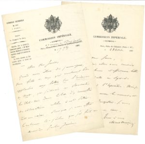 3 pages et quart in-8 à en-tête Exposition Universelle de 1867 à Paris, Service du Rapport du Jury, Commission Impériale et vignette aux armes impériales. 17 septembre 1868. Il envoie à Janin ses derniers travaux, Exposition universelle de 1867, Rapports du jury international. Introduction par M. Michel Chevalier : « Quand nous étions des jeunes-gens, vous fûtes de ceux qui voulurent bien applaudir aux Lettres sur l’Amérique du Nord, que j’écrivais en parcourant les États-Unis dans le but d’y recueillir des observations utiles à notre Patrie ». Il lui offre ce volume « que j’ai fait en parcourant, exactement dans la même pensée, les cinq parties du monde condensées dans mes galeries de l’Exposition du Champ de Mars ». Il y trouvera peu « de ces aperçus scientifiques et des ces descriptions techniques pour lesquelles vous avez peu de goût. Vous y trouverez peut-être quelques-unes de ces échappées historiques que vous aimez »… 28 octobre 1868, remerciant de « la bonne et affectueuse lettre que vous m’avez écrite au sujet de mon volume relatif à l’Exposition »…
