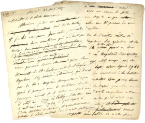 Brouillon, avec de nombreuses ratures et corrections, d’une lettre adressée au journal des Français réfugiés en Amérique, réfutant l’authenticité du Manuscrit de Sainte-Hélène publié à Londres en 1817.