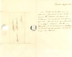 demi-page in-8, adresse. Au valet de chambre et exécuteur testamentaire de Napoléon. Elle le remercie de l’envoi des « médaillons des cheveux de l’Empereur, c’est un souvenir bien précieux pour elle. Elle sait avec quel dévouement il a soigné l’Empereur, elle lui en témoigne de la reconnaissance et l’assure de l’intérêt qu’elle prendra toujours à ce qui lui arrivera ».