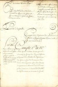 cahier de 40 pages in-fol. « Compte 2e de Me Pierre Charles de Villette, Receveur general alternatif des finances des provinces de Flandres et Haynault des Recette et Depense par luy faites ». Le manuscrit , double établi pour M. de Beaufort, procureur, détaille, au titre des recettes les taxes et impôts sur les villes de Lille, Valenciennes, Maubeuge, Le Quesnoy, Landrecy, Avesnes, Charlemont, Prévôté le Comte, ; au titre des dépenses dans les provinces de Lille et Hainaut, les deniers payés au Trésor Royal, les diverses taxations des Trésoriers ou commis de l’extraordinaire des guerres, des employés des domaines et des employés aux traites, des commis chargés du recouvrement, collecteurs et receveurs etc. Sont indiquées aussi les Reprises pour les décharges, modérations ou doubles emplois et autres, accordées aux habitants ou employés de plusieurs villes, gouvernements et territoires (Dunkerque, Valenciennes, Cambrai, Saint-Amand, etc.). Est notée également la dépense commune « pour la façon et ecriture de l’original de ce compte et du présent double ». Le compte final n’étant pas équilibré, le comptable doit 42 219 livres 2 sols. D’une autre main, il est indiqué que le comptable est condamné à payer au Trésor Royal cette somme augmentée d’intérêts (jugement du 18mai 1738), mais ce comptable sera finalement déchargé de ces intérêts.