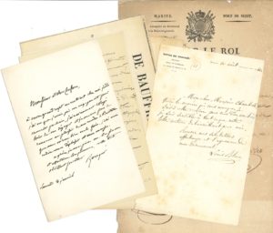 G. Abric, d’Armaing (révélation d’un complot, 1826), Ch. Allard, F.A. Baudin, prince de Bauffremont-Courtenay, P.A. Berryer, Bienaimé, duc de Blacas, L. Blanc, P. Bouillet, L. de Bourbon, J. Cambon, psse de Caraman-Chimay, Castelbajac, A. Castelnau, gal Chanzy, Charles X (et S. de La Rochefoucauld), Chauveau-Lagarde, duc de Crussol, J. van Driesten, Drouyn de Lhuys, duc d’Escars, d’Estissac, Gramont-Caderousse, J. Lainé, Ch. Lagrange, Laisné de Villévêque, Et. Lamy, Eug. Lamy (à J. Janin), H. Langlois, Ch. Laurent, St. Lauzanne, H. Le Roux, Louis-Philippe, H. Lyautey (et photos), Macdonald, dsse de Mazarin d’Aumont, Mocquard, duc de Montebello, duc de Montmorency, Morny, pce de la Moskowa, L. Murat, Casimir Périer, Annie Pétain, G. Pichon, pce de Polignac, Rapetti (ms concernant une inscription judaïque), Saint-Marc, A. Thiers, gal Verraux, mis de Villette, etc. Plus divers documents joints, dont 2 affiches de jugement de conseil de guerre.