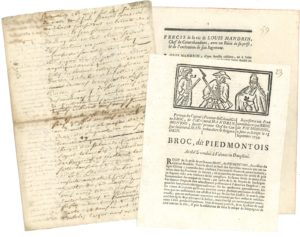 Imprimés : Arrest du Conseil d’Etat du Roy et lettres patentes […] qui autorisent les Employés des fermes à arrêter & écrouer les Contrebandiers (1747) ; – Précis de la vie de Louis Mandrin, Chef de Contrebandiers, avec un Récit de sa prise, & de l’exécution de son Jugement ; – Jugement souverain qui a condamné à la roue Louis Mandrin… (1755) ; – Complainte nouvelle sur la prise de Louis Mandrin (1755) ; – Portrait du Capitaine Broc, dit Piémontois, successeur du Général Mandrin… (1755, avec bois gravé en bandeau).